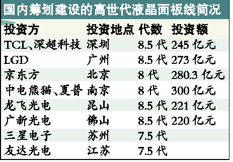 截至目前,國家發改委批準的高世代液晶生產線項目有昆山的龍飛光電、深圳的華星光電以及北京的京東方等國內企業主導的項目,日本和韓國企業的項目還在焦急等待。