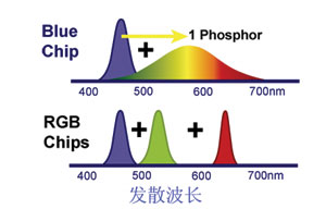 一般而言,小型LCD顯示屏背光照明都是用一組白光LED來實現的。可是,使用白光LED的問題是其光譜對光復制并不是很理想。原因是白光LED其實就是在藍光LED面上加上一層黃色磷光劑。這樣便造成光譜有兩個波峰,一個在藍色而另一個在黃色。圖3給出一個典型的白光LED與RGBLED光譜比較。