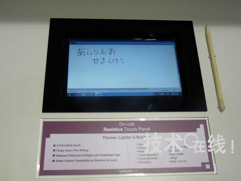 韓國三星電子此次展出了兩款內置觸摸面板功能的On Cell方式液晶面板。分別為是(1)嵌入電阻膜式觸摸面板功能的10.1英寸液晶面板,以及(2)嵌入靜電容量式觸摸面板功能的13.3英寸液晶面板。兩款產品均可4點輸入。目前正以2011年開始量產為目標推進開發。