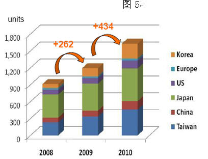 晶粒方面,預(yù)估全球MOCVD數(shù)量逐步增加(圖5),其中以韓國和臺灣廠商最為積極,Samsung, LG Innotek以及AUO旗下的Lextar都將增加MOCVD機(jī)臺數(shù)量至目前的2~3倍。到2010年底,預(yù)計全球高亮度LED晶粒月產(chǎn)能將接近200億,但目前市場應(yīng)用仍以移動終端產(chǎn)品和汽車照明用為主,前兩者的應(yīng)用比重高達(dá)55%,但TV用背光源應(yīng)用比重總體仍將難突破20%,因此背光源缺貨狀況的緩解將需要較長時間。