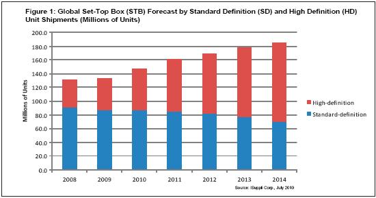 高清STB的出貨量最近幾年保持快速增長。2009年,高清STB出貨量增長600萬個(gè)以上,從2008年的3910萬個(gè)增長到4520萬個(gè)。到2012年,高清STB出貨量將首次超過標(biāo)清(SD)STB。到2014年,高清STB將達(dá)到1.14億個(gè),復(fù)合年度增長率為20.3%。