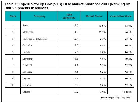 與此同時(shí),2009年市場份額數(shù)據(jù)顯示,隨著Pace公司完成對(duì)飛利浦STB業(yè)務(wù)的收購,正在成為新的市場份額王者。