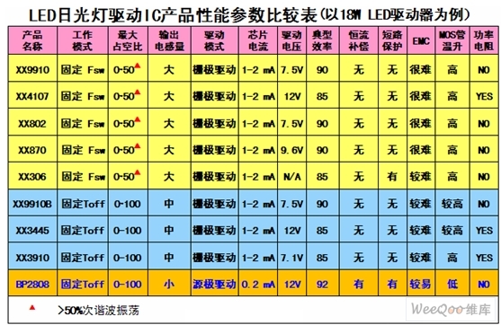 目前可使用的LED日光燈驅動IC有好幾種,其性能參數都有差異,現列表1供設計選型參考。從中可見BP2808的固定Toff工作模式、100%占空比、芯片工作電流僅0.2mA、效率達92%、恒流補償和使用獨特的源極驅動模式等特性,使其具有適用于LED照明燈具的明顯優勢。