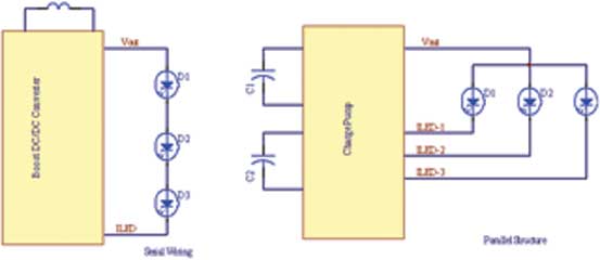 就這點而言,我們可以考慮采用串聯或并聯方式對LED進行連接:這兩種連接方式各有其優缺點,見圖2。