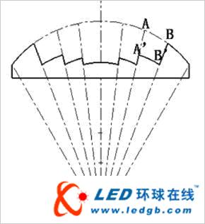進一步分析知道,由于LED光源是在光軸部分的發光強度大,邊緣部分小,而分厚度法得到的鋸齒恰恰是在中間部分比在邊緣部分有更大的齒距(見圖3),因此在光強度大的地方損失會少,即總體上可以有更少的光損失。