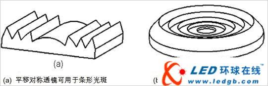 顯然圖1(b)這一菲涅爾透鏡比透鏡(a)要薄,從而吸收小,節省材料。但這種按傳統方法設計的透鏡只對平行光是正確的,這時(c)中陰影部分對光線是沒有影響的。但是若是非平行光,如LED為光源時,(c)中的陰影部分對光線就有影響了。若把它刪除制成菲涅爾透鏡,就會造成很大的雜散光。此外,若透鏡的截面用折線代替小弧線,也會帶來光學上的誤差。