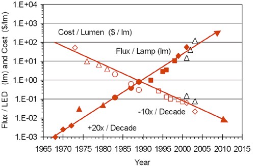 上述的講法聽來有些讓人疑惑,今日不是一直強調LED的亮度突破嗎?2003年LumiledsLighting公司RolandHaitz先生依據過去的觀察所理出的一個經驗性技術推論定律,從1965年第一個商業化的LED開始算,在這30多年的發展中,LED約每18個月;24個月可提升一倍的亮度,而在往后的10年內,預計亮度可以再提升20倍,而成本將降至現有的1/10,此也是近年來開始盛行的Haitz定律,且被認為是LED界的Moore(摩爾)定律。