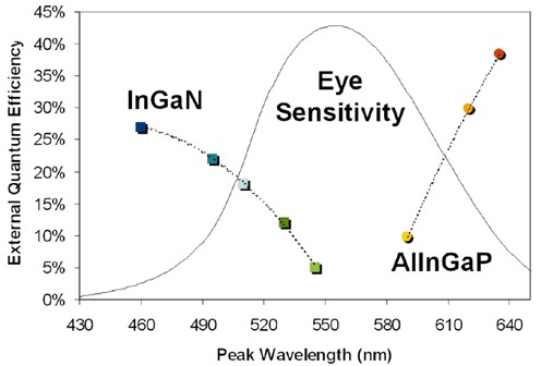 圖中為InGaN與AlInGaP兩種LED用的半導體材料,在各尖峰波長(光色)下的外部量子化效率圖,雖然最理想下可逼近40%,但若再將光取效率列入考慮,實際上都在15%;25%間,何況兩種材料在更高效率的部分都不在人眼感受性的范疇內,范疇之下的僅有20%。