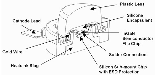 從Lumileds公司Luxeon系列LED的橫切面可以得知,硅封膠固定住LED裸晶與裸晶上的熒光質(若有用上熒光質的話),然后封膠之上才有透鏡,而裸晶下方用焊接(或導熱膏)與硅子鑲嵌芯片(SiliconSub-mountChip)連接,此芯片也可強化ESD靜電防護性,往下再連接散熱塊,部分LED也直接裸晶底部與散熱塊相連。