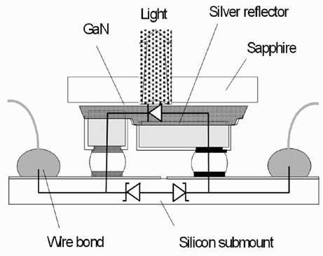 Lumileds公司Luxeon系列LED的裸晶實行覆晶鑲嵌法,因此其藍寶石基板變成在上端,同時還加入一層銀質作為光反射層,進而增加光取出量,此外也在SiliconSubmount內制出兩個基納二極管(ZenerDiode),使LED獲得穩壓效果,使運作表現更穩定。