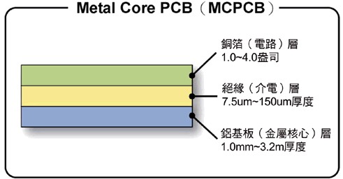 為了強化LED的散熱,過去的FR4印刷電路板已不敷應付,因此提出了內具金屬核心的印刷電路板,稱為MCPCB,運用更底部的鋁或銅等熱傳導性較佳的金屬來加速散熱,不過也因絕緣層的特性使其熱傳導受到若干限制。(制圖:郭長佑)