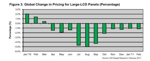 預計2月份大尺寸LCD電視面板價格下降1.2%。但是,10月以來價格下滑速度不斷放緩,2月降幅是2010年6月以來最小。未來兩個月面板價格可能保持平穩,4月將推出新款電視,而5月中國將迎來勞動節假日。