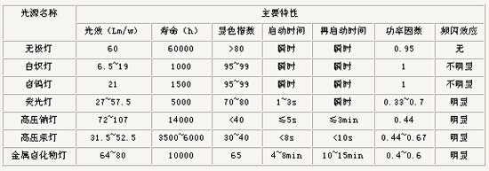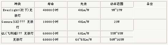 無極燈與其它光源參數值比較