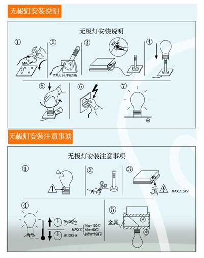 2)工作時環境溫度不得超過50℃; 3)必須與無極熒光燈燈泡正確連接后,方可接通電源;