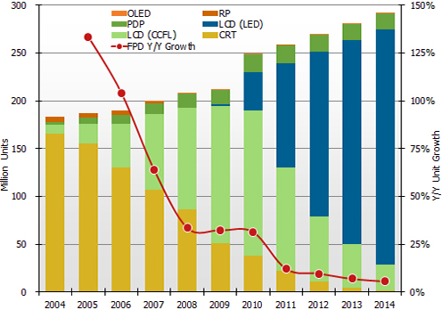 • 預(yù)計(jì)總體液晶電視出貨量將穩(wěn)步增長,到2014年達(dá)到2.7億臺(tái)