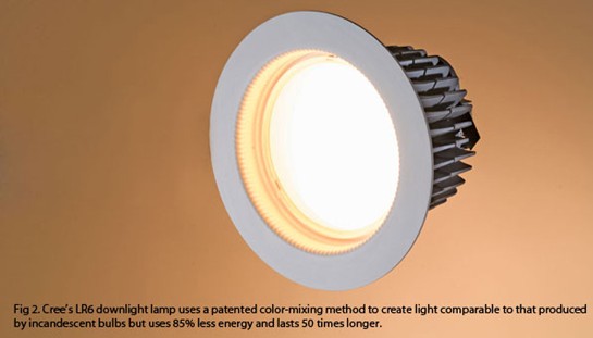 另外,LED輸出水平已經達到150流明/瓦,而且還在繼續上升。幾家LED廠商生產的高亮度LED,可以提供顏色范圍較寬的照明。例如,Cree公司生產的LR6筒燈,采用了獲得專利的顏色混合方法,所發出的光可以媲美白熾燈,但功耗要比白熾燈減少85%,而壽命是它的50倍。