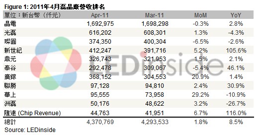 集邦科技(TRENDFORCE)旗下研究部門LEDinside統(tǒng)計(jì), 2011年4月臺(tái)灣上市上柜LED廠商營(yíng)收總額約96.2億元,(MoM+3.39%,YoY+6.6%)。從上游芯片廠營(yíng)收來(lái)看,2011年四月份臺(tái)灣地區(qū)上市柜LED芯片/晶粒廠營(yíng)收43.7億元,與去年同期相比,成長(zhǎng)8.5%,(MoM+1.8%; YoY+8.5%)。下游LED封裝方面,四月份臺(tái)灣地區(qū)上市柜LED封裝廠營(yíng)收達(dá)到52.5億元,與去年同期相比,成長(zhǎng)5% (MoM+2.9%,YoY+5%)。整體表現(xiàn),LED背光源市場(chǎng)穩(wěn)定拉貨,四月?tīng)I(yíng)收持平成長(zhǎng)。
