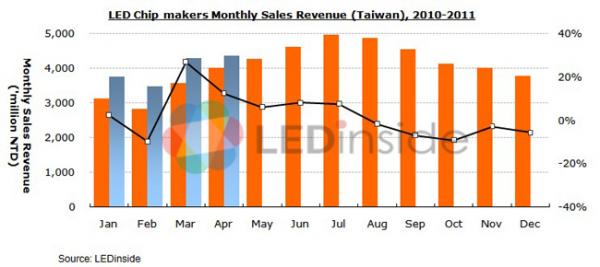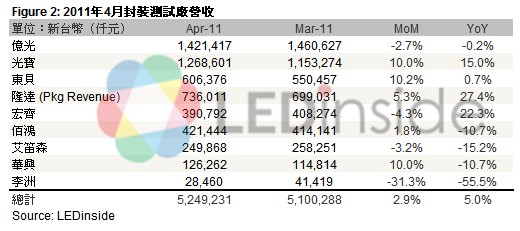 - 011年4月臺(tái)灣上市上柜LED廠商營(yíng)收總額約96.2億元