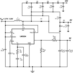 如今各種微型電壓升降壓芯片技術也日顯成熟,產品也在不斷增加,符合PMP/MP4、DSC、DV的TFT-LCD需要的,能同時多路輸出它們需要的不同電壓的集成電源管理芯片組(SOC)也在迅速推出之中。TFT-LCD顯示器系統需要多檔電源電壓,如PMP/MP4常用的三星3.5_和4_的TFT-LCD,它們的結構如圖3所示,它們由TFT玻璃(TFTglass)、顏色濾波器(Colorfilter)、顯示區(Displayarea)、背光板和背光源(Backlight)四部分疊加組成。圖4是三星3.5_的TFT-LCD電路圖。它們的主要技術參數是:VIN=2.1-4.0V,VSW=15V/1.4A、VS=15V;用6個LED串聯做背光源,每個LED的VF=3.4V、IF=20mA,因此需要一個24V/50mA的電壓來驅動。常常選用帶電感的DC/DC來升壓,再加上倍壓電路,輸出多檔電源電壓滿足TFT-LCD的需要,如圖5所示。目前MP3、PMP/MP4、DSC、DV等的小尺寸TFT-LCD屏的低成本背光驅動方案常常是采用這種方法來設計實用電路的。
