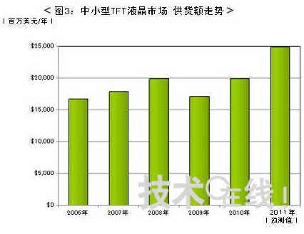 圖3表示中小型液晶市場過去5年內的業(yè)績與今年的供貨額預測。手機及數碼相機等使用的中小型FPD因價格不斷降低,市場范圍逐步擴大,導致中小型液晶 市場的供貨額與供貨量增長幅度相比,持續(xù)出現了低增長,因2008年雷曼危機后消費低迷,這一市場陷入了供貨額大幅減少的局面。在此期間,許多中小型液晶 廠商都有過力圖通過縮小業(yè)務而生存下去的辛酸經歷,包括同行業(yè)廠商間的業(yè)務撤銷與合并以及淘汰設備等。