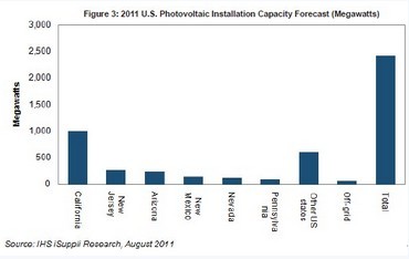 據IHS iSuppli公司的光伏市場研究報告,2011年美國光伏(PV)安裝容量將大增166%,總體安裝容量將達到2.4GW,加州將一馬當先。
