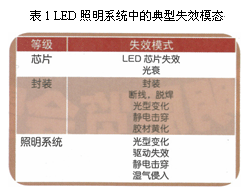 LED模組和燈具的典型失效模式包含了不同層次的失效模式,涉及到LED封裝結構以及工藝過程(如表1)。LED在實際使用中,由于復雜的環(huán)境以及封裝工藝局限性從而使封裝材料退化、熒光粉退化、金屬電遷移、局部溫度過高產生的熱應力所引起的芯片和硅膠的分層或金線斷裂等等,從而影響LED發(fā)光甚至導致整個LED的失效。而且LED產生的高溫會導致芯片的發(fā)光效率降低,光衰加快、色移等嚴重后果。