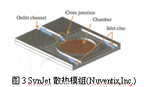 除了熱界面外,主動散熱系統(tǒng)已越來越受企業(yè)的歡迎。圖3給出了SynJet主動散熱模塊,它可以產生脈動空氣,從而可以把LED燈內部的熱直接帶到外面。據(jù)了解,SynJet技術可以幫助設計師解決一些產品的散熱問題,如電腦產品,特別是高可靠性的LED產品。該技術有高散熱效率、低噪音、高可靠性和低功耗等優(yōu)點。