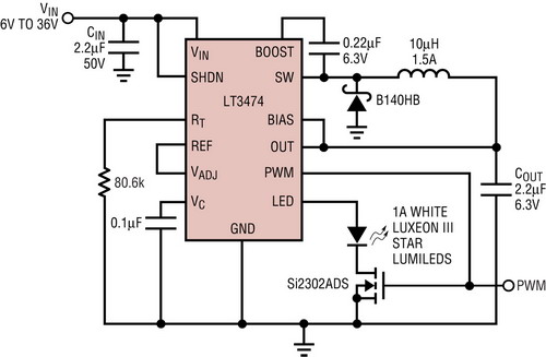 LED亮度可由圖1中的LT3474來(lái)控制,把一個(gè)模擬電壓輸入連接至VADJ引腳或把一個(gè)數(shù)字PWM信號(hào)輸送至PWM調(diào)光MOSFET的柵極和PWM引腳。簡(jiǎn)單的模擬亮度控制通過(guò)降低內(nèi)部檢測(cè)電阻上的電壓,將恒定LED電流從1A降至更低的值,但是LED光線的顏色在低電流時(shí)會(huì)變化。調(diào)光比的實(shí)際限制大約為10:1。
