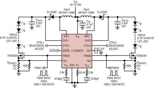 就夜間觀看極亮的顯示器而言,LT3486以其獨(dú)特的內(nèi)部PWM調(diào)光架構(gòu)提供1000:1的PWM調(diào)光比。內(nèi)部LED電流存儲(chǔ)器具有超快PWM響應(yīng)時(shí)間,可以低于10us的時(shí)間讓LED電流從零返回到100mA,以實(shí)現(xiàn)真彩PWM調(diào)光。在高端顯示器中用兩個(gè)LT3486驅(qū)動(dòng)分別代表紅、綠、綠、藍(lán)(R-G-G-B)的4個(gè)LED串,可實(shí)現(xiàn)1000:1的調(diào)光比,并在非常暗的夜間工作環(huán)境保持顯示器的真彩特性。