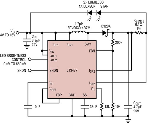 圖3所示的LT3477降壓-升壓型LED驅(qū)動(dòng)器以1A電流驅(qū)動(dòng)兩個(gè)大功率LED。這兩個(gè)LED無(wú)需以地為基準(zhǔn),連接的兩個(gè)端子一般是轉(zhuǎn)換器的輸出和電池輸入。LT3477有兩個(gè)獨(dú)特和具100mV浮動(dòng)電流檢測(cè)輸入引腳,這引腳連接與LED串串聯(lián)而且不以地為基準(zhǔn)的電流檢測(cè)電阻。在汽車電池的工作電壓范圍內(nèi)以及低于這個(gè)范圍時(shí),在電流直到1A的情況下都可實(shí)現(xiàn)準(zhǔn)確的LED穩(wěn)流。LT3477的停機(jī)引腳用于實(shí)現(xiàn)車燈的接通/斷開功能,并在未使用時(shí)將輸入電流降低到1uA(典型值為100nA)。IADJ引腳用來(lái)為后部信號(hào)指示燈或剎車燈等剎車燈和尾燈應(yīng)用實(shí)現(xiàn)高于10:1的模擬調(diào)光比。這類應(yīng)用無(wú)需真彩PWM調(diào)光。