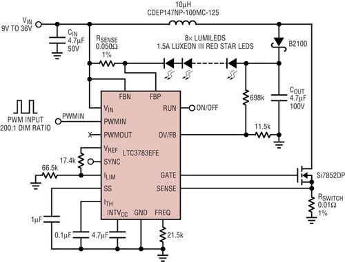 如圖4所示,大功率LED驅(qū)動(dòng)器LTC3783采用降壓-升壓型拓?fù)洌?qū)動(dòng)6至10個(gè)3W紅光LED,用于汽車尾燈應(yīng)用。外部開關(guān)MOSFET和開關(guān)電流檢測(cè)電阻為大功率和高壓LED驅(qū)動(dòng)器設(shè)計(jì)提供了最大的設(shè)計(jì)靈活性。如果電池電壓降至低于9V,那么9V至36V輸入和在電流為1.5A時(shí)高達(dá)25V的LED串輸出需要100V的額定開關(guān)電壓和高于8A的峰值開關(guān)電流能力。在整個(gè)汽車電池電壓范圍內(nèi),1.5A恒定電池電流是良好穩(wěn)定的。就剎車燈和尾燈調(diào)光而言,在100Hz時(shí),可以用直接連接到LTC3783PWM引腳的PWM信號(hào)降低LED電流,以實(shí)現(xiàn)高達(dá)200:1的調(diào)光比。在1kHz時(shí),調(diào)光比降低至?20:1,這對(duì)尾燈應(yīng)用來(lái)說(shuō)已足夠了。調(diào)節(jié)ILIM引腳也可以降低LED電流。