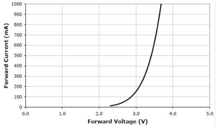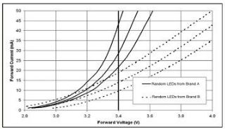 從圖中可以看出,假如采用恒壓電源供電,它們之間的正向電流就會有很大的差異。而過大的正向電流也會導致光衰的加速,所以一定要用恒流源供電。