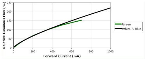 由圖中可以看到,如果正向電流從350mA降低8.75倍到40mA,其相對發光強度將從100降低到20。降低將近5倍。顯然這是完全不能允許的。所以一定要把電流恒定。