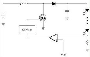圖中顯示了一個基本的電感升壓電路,其中控制器(Control)給出了一個PWM開關信號來控制大功率開關管,后者在導通時對電感充電,而在斷開時電感中的能量就對電容充電。經過幾次開關以后就可以把輸入電壓泵至更高的電壓,從而完成升壓的任務。改變PWM信號的工作比就可以改變其輸出電壓。為了保持輸出電流的恒定,就要求測量輸出電流值,這是靠一個和LED串聯的小電阻來測量的。這個電阻上的電壓就和一個參考電壓相比較,比較所得出的誤差信號就送去控制器用以改變PWM信號的工作比,這樣就實現了一個閉環自動控制,以控制其輸出電流為恒定。