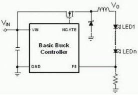 通常儲能電感是和LED串聯,開關導通時,電感儲能;開關斷開時電感通過二極管繼續有電流流通。由于輸出電壓是輸入電壓減去電感電壓,所以是降壓型。LED中的電流經過檢測電阻測量以后反饋回控制器。來控制PWM的工作比,以實現恒流的控制。