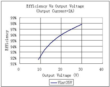 降壓型恒流源的缺點是要求輸入電壓高于輸出電壓,而太陽能LED路燈中所采用的蓄電池往往是12V,頂多是24V。而路燈中的LED通常是10個串聯,其所要求的總輸出電壓往往在33V-36V左右,因此較難采用降壓型的恒流源。而降壓型恒流源的優點是效率高。因為輸入電壓高于輸出電壓,所以輸入電流小于輸出電流。電流小有助于減小電阻性損耗。圖15表明一個降壓型恒流源在輸入電壓固定在35V,輸出電流固定在2A時,其效率和輸出電壓的關系曲線。