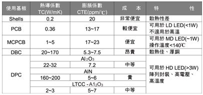 以下將LED散熱封裝材料之比較列于表3,早期LED以炮彈型方式進行封裝,其散熱路徑中有一小部分熱源經(jīng)保護層往大氣方向散熱,大多熱源僅能透過金屬架往基板散熱,此封裝熱阻相當?shù)卮螅_250~350℃/W。 進而由表面貼合方式(SMD)于PCB基板上封裝,主要是藉由與基板貼合一起的FR4載板來導熱,利用增加散熱面積的方式來大幅降低其熱阻值。 但此低成本的封裝要面臨的問題是,F(xiàn)R4本身熱傳導系數(shù)較低,膨脹系數(shù)過高,且為不耐高溫的材料,在高功率的LED封裝材料上不太適用。