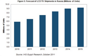 據(jù)IHS iSuppli公司的電視研究報(bào)告,隨著青睞先進(jìn)電視技術(shù)的中產(chǎn)階級不斷壯大,今年俄羅斯液晶電視出貨量預(yù)計(jì)強(qiáng)勁增長10%。俄羅斯屬于所謂的金磚國家(BRIC),是一個(gè)重要市場。