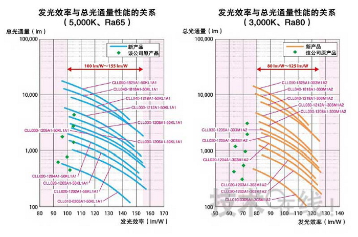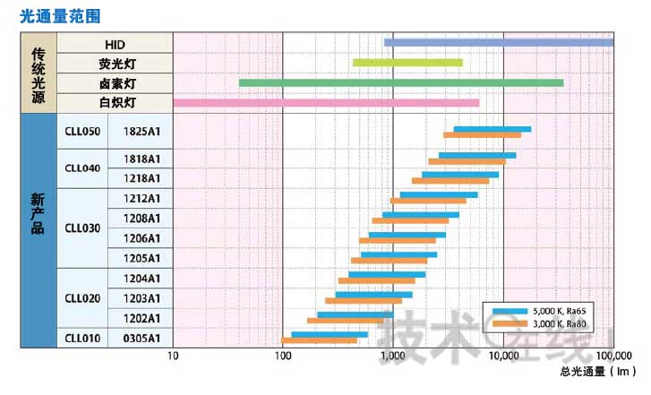 除了CLL-050系列外,西鐵城電子還發布了亮度最大分別為590lm、1970lm、5780lm以及1萬2915lm的不同封裝的4個系列。包括CLL-050系列在內的5個系列產品,覆蓋了95~1萬7675lm的亮度范圍,可以應對從10W白熾燈泡到300W汞燈的廣泛需求。