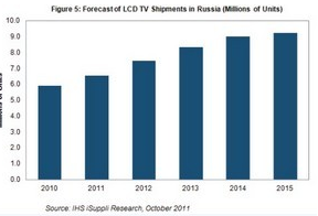 據(jù)IHS iSuppli公司的電視研究報告,隨著青睞先進電視技術(shù)的中產(chǎn)階級不斷壯大,今年俄羅斯液晶電視出貨量預(yù)計強勁增長10%。俄羅斯屬于所謂的金磚國家(BRIC),是一個重要市場。