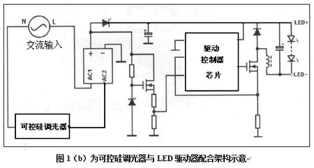 所以它是LED照明常用方法,見圖1(b)所示可控硅調光器與LED驅動器配合架構示意。