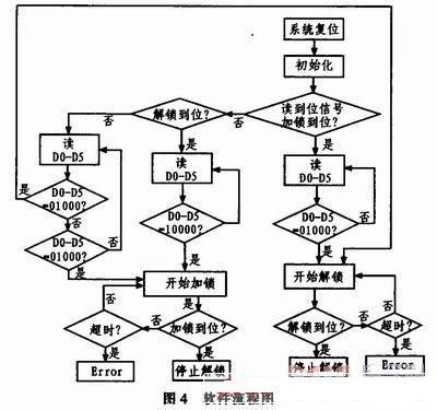 當信號D0-D5為10000時,單片機通過P10口對方位鎖定機構(gòu)發(fā)出加鎖命令,控制命令經(jīng)SN54LS245驅(qū)動后作用于R9和VQ1,VQ1導通后,繼電器K2的4、5導通,輸出+28 VLOCK信號控制電機進行加鎖。完全鎖定后,光電開關(guān)輸出(上)信號輸出高電平即圖3中STOP+,STOP+通過上拉電阻R16作用于R10和VQ2,VQ2導通后,繼電器K3的4、5和8、9導通,+28 V LOCK信號切斷,硬件上先停止加鎖控制,防止造成機構(gòu)硬件損傷。而K3的8、9導通后,F(xiàn)WH+輸出+5 V電平給單片機,單片機接收信號后,終止加鎖命令,VQ1截止,K3恢復常態(tài)。解鎖過程和加鎖過程類似,在此不作贅述。