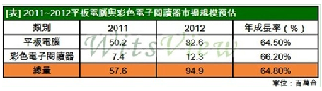 整體而言, WitsView 認(rèn)為 2012年平板電腦的發(fā)展基調(diào)將偏向樂觀,預(yù)估平板電腦本身的需求達(dá)8,260萬臺,彩色電子閱讀器方面則為1,230萬臺,兩者合計的市場規(guī)模將從今年的5,760萬臺攀升至9,490萬臺,年成長率高達(dá)65%。