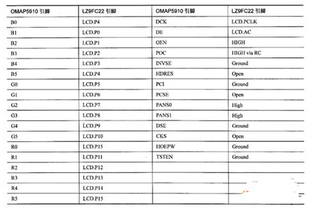 LZ9FC22和OMAP5910的LCD控制器連接,由于LZ9FC22是18位控制器(RGB信號各有6位),而OMAP5910的LCD控制器的輸出只有16位數據,為此必須損失兩位數據,將LZ9FC22的R0和BO接地,或者將R0和R5、BO和B5連接在一起。