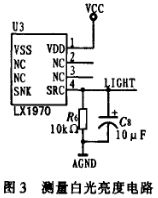 可見光檢測模塊采用LX1970作為核心芯片。LX1970是美國微型半導(dǎo)體(Microsemi)公司推出的一種能實現(xiàn)人眼仿真的集成化可見光亮度傳感器。該模塊采用測量白光亮度電路(如圖3)。利用src端輸出光-流轉(zhuǎn)換的結(jié)果,然后實現(xiàn)流壓轉(zhuǎn)換。該芯片性能穩(wěn)定,靈敏度極高。