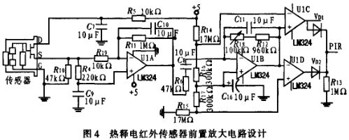 熱釋電紅外傳感器能以非接觸形式檢測出人體輻射的紅外線,并將其轉(zhuǎn)變?yōu)殡妷盒盘枴1驹O(shè)計所采用的是PIR熱釋電傳感器,安裝有菲涅爾透鏡,感應(yīng)距離7 m,感應(yīng)角度110°。具有全自動感應(yīng)、光敏控制、兩種觸發(fā)方式(不可重復(fù)觸發(fā)方式,可重復(fù)觸發(fā)方式)、靈敏度高、微功耗等特點。當人進入其感應(yīng)范圍,則輸出高電平,人離開感應(yīng)范圍,則自動延時關(guān)閉高電平,輸出低電平。但是該熱釋電紅外傳感器只能檢測到動態(tài),所以對于長時間處于相對靜態(tài)的存在無法檢測的缺陷。熱釋電紅外傳感器前置放大電路如圖4所示。