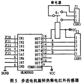 為此,采用了步進電機模塊。設(shè)計中,將熱釋電紅外和步進電機固定一起。單片機P1.0~P1.3口分別經(jīng)過74LS14雙上升沿D觸發(fā)器電平轉(zhuǎn)換后,通過芯片ULN2003驅(qū)動步進電機旋轉(zhuǎn)(電路設(shè)計如圖5),從而可以旋轉(zhuǎn)熱釋電紅外傳感器,檢測到靜態(tài)。