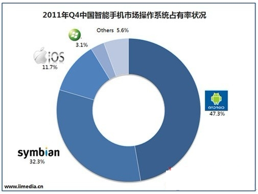 報告還顯示,在中國智能手機操作系統市場占有率方面,2011Q4中國智能手機市場主流的操作系統中,Symbian占32.3%,iOS占11.7%,而Android的表現非常令人欣喜,已經飆升到47.3%,達到歷史空前水平。