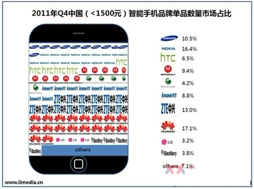 在智能手機市場品牌占有率狀況方面,艾媒咨詢數據顯示,2011年第四季度中國智能手機市場諾基亞、三星、蘋果分別占有32.9%、17.3%、11.7%。艾媒分析認為,雖然諾基亞智能手機憑借其良好的壽命,仍占市場1/3強,但是諾基亞的市場份額正在持續萎縮;而三星、蘋果等海外品牌發展迅猛;華為為首等一批國產手機品牌通過和運營商合作推出“千元智能手機”而逐漸擴大市場份額。