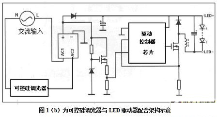 所以它是LED照明常用方法,見圖1(b)所示可控硅調光器與LED驅動器配合架構示意。
